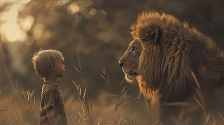 a little boy with smooth blonde hair, fearlessly playing with a majestic lion, showcasing the bond of trust and friendship between human and beast