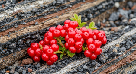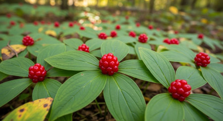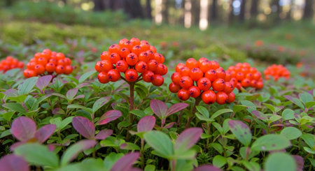 Detailed focus on the forest's wild berries reveals their natural texture, vibrant red hues contrasting with lush green foliage