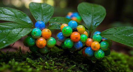 Vibrant orange berries surrounded by lush green leaves at dusk in a serene forest setting