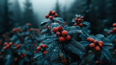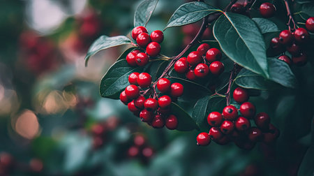 A captivating closeup of lush green leaves adorned with bright red berries, showcasing nature's beauty and the vibrant colors of the organic world.