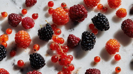 A vibrant array of fresh berries, including raspberries, blackberries, and currants, scattered on a marble surface, showcasing their rich colors and natural beauty.