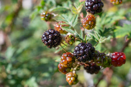 Ripe and unripe blackberries on the bush with selective focus. Bunch of berries.