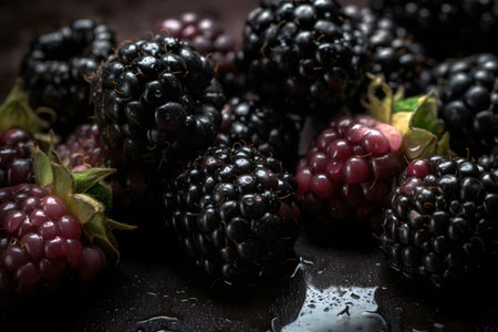 A close-up of juicy blackberries with a vibrant texture and dew drops, giving a feeling of freshness and summer mood.