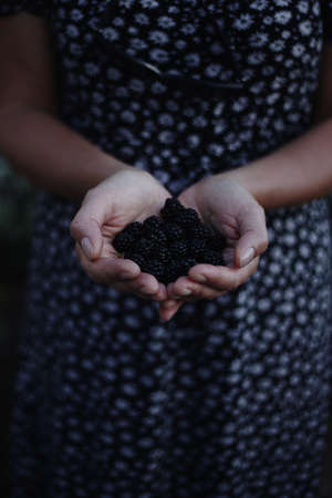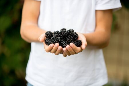 organic fruit. Farmers hands with freshly harvested fruit. Fresh organic blackberries.