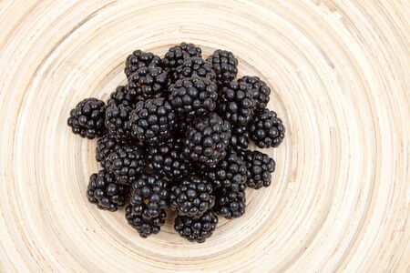 Fresh ripe organic blackberries in a bowl on a wooden rustic background
