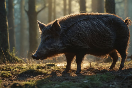 An atmospheric scene with a wild boar standing alert in a forest bathed in sunlight.