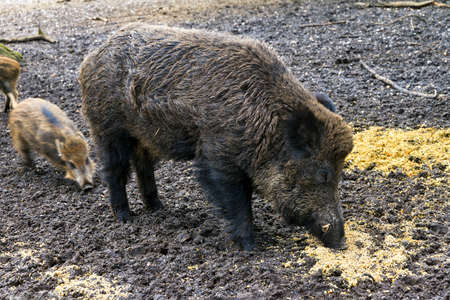 Young strong wild hog boar, a large specimen, in the forest rooting in mud for food