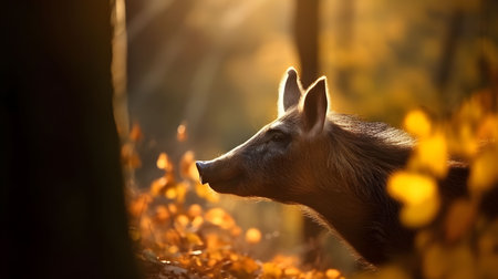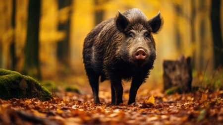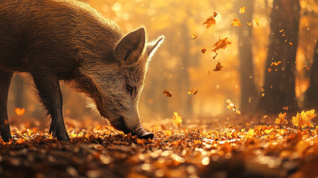 Majestic Wild Boar in Autumn Forest with Golden Leaves and Soft Lighting AI Generative