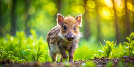 This captivating image showcases a precious baby wild boar, a delightful creature of the natural world. The adorable piglet, with its soft fur and inquisitive gaze, is a true testament to the beauty found in wildlife photography. The image's composition expertly utilizes the rule of thirds, drawing the viewer's eye to the central subject while maintaining a sense of balance and harmony with the surrounding environment. Notice how the piglet is positioned off-center, creating a dynamic visual impact and drawing attention to its delicate features. The blurred background, achieved through a shallow depth of field, ensures the piglet remains the focal point, further enhancing the image's aesthetic appeal.