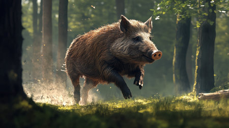 A dynamic wild boar leaps through a green forest, showcasing its vitality and the richness of nature. The scene captures the essence of wildlife in motion.
