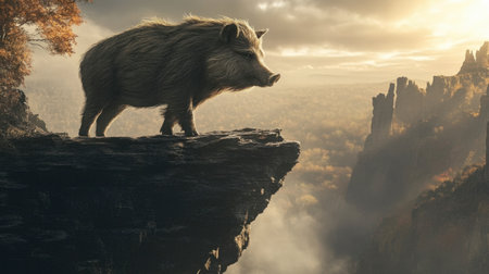 A powerful wild boar stands majestically on a cliff, gazing across a breathtaking landscape at sunset. The scene captures the beauty and wildness of nature.