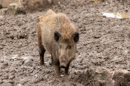 Saint Gallen, Switzerland, October 19, 2024 Wild boar in the mud in a wildlife park