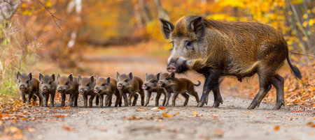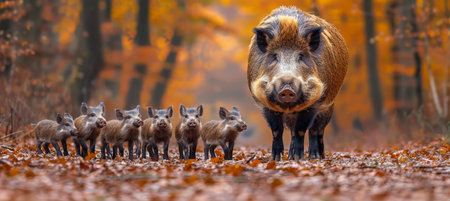 Wild Boar Family Portrait, a Mother Boar with her Piglets in the Splendor of an Autumn Forest