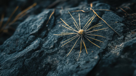 This striking close-up image features a unique spiky plant resting on a rocky surface, illuminated by warm afternoon sunlight. The intricate details highlight the beauty of nature.