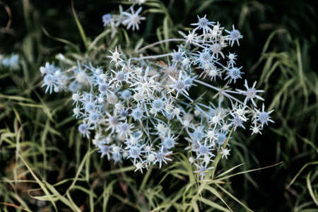 Eryngium yuccifolium. Bluebrier yuccolist growing in a wild nature, park, garden in summer or fall. Plant with round flowers on long stems. Natural green brown blurred background. Perennial plants.