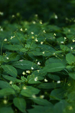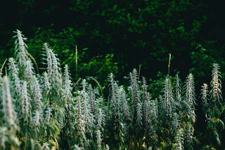 Flowering bushes of Motherwort in the forest. Medical herbs Dark background