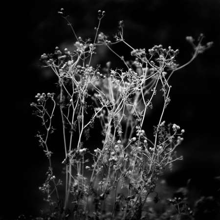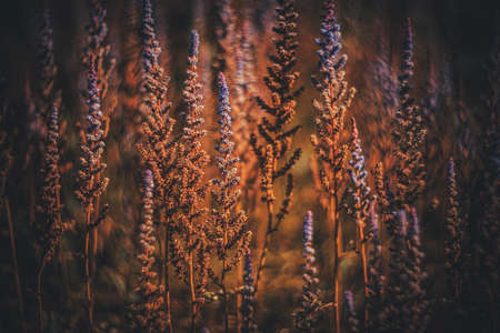 Dried flowers of brown color close-up on a plain dark background in the autumn in the light of the evening sun
