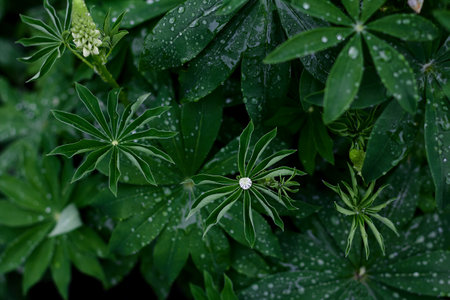 Vibrant foliage displaying raindrops adorns a tranquil garden, showing nature's beauty and the freshness after rainfall.