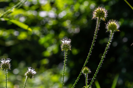 Small thistle blossoms in the evening light at the edge of the forest