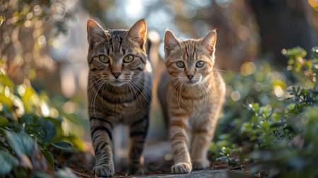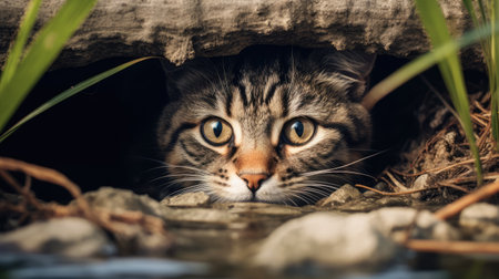 - Capture the tranquility of nature with this serene image of a cat nestled amidst golden sunset leaves- A glimpse of feline curiosity and peaceful contentment in the warm embrace of the setting sun- The perfect shot for animal lovers and nature enthusiasts seeking a touch of tranquility to adorn their walls- A magical moment frozen in time, showcasing the beauty of the natural world and the gentle spirit of its inhabitants- A serene escape into the heart of nature, where a curious feline companion invites you to share in its peaceful sanctuary AI Generative