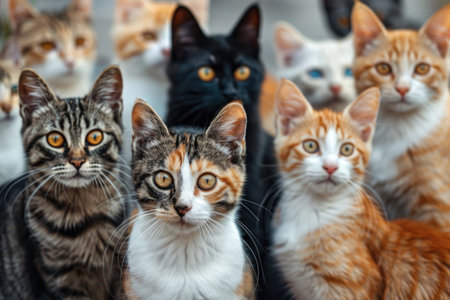 A variety of cats with distinct fur patterns and colors gather closely together, showcasing their engaging expressions. The setting emphasizes their diversity and charm, highlighting various breeds.
