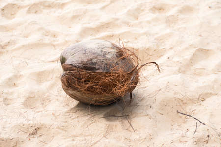 close-up of open coconut on white sand in ocean beach with water waves