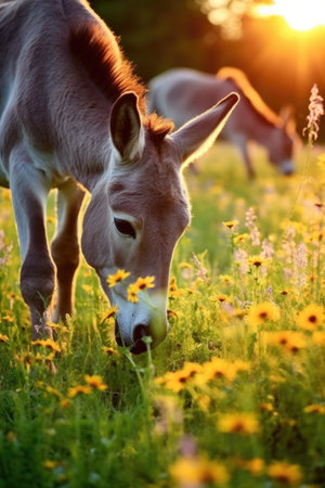 donkey grazing in a sunlit meadow with wildflowers, created with generative ai