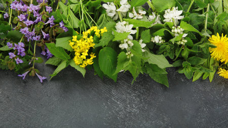 Edible plants and flowers on a dark background. Wild herbs as sources of carotenoids. Flat lay, top view, copy space