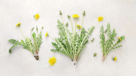 Fresh dandelion on light background. Edible plant and nectariferous. Top view, flat lay, copy space