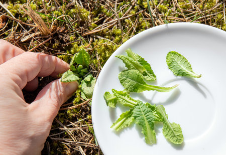 Person hand picking Primula veris, cowslip, common cowslip, cowslip primrose, Primula officinalis Hill fresh green leaves outdoors from meadow, for eating. Healthy spring snack ful