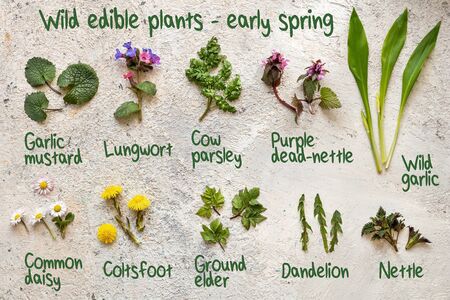 Lungwort, wild garlic, cow parsley and other medicinal herbs and wild edible plants collected in early spring, with inscriptions