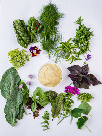 Edible plants collection isolated on white background. Garlic chives Dandelion Chervil Chickweed Yarrow Ladys Mantle Garlic mustard Alliaria Petiolata Glechoma Lemon Balm Urtica Bear Garlic.