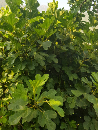 Green figs ripening on the tree in sunshine. Figs of Asia