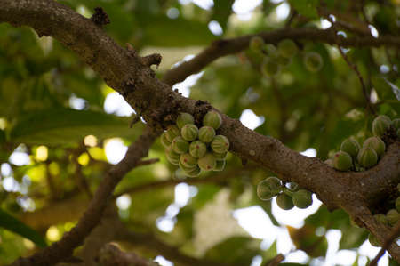 CAULIFLORIA flowers berries directly on tree trunk of woody plants or on old branches. Typical for tropical rainforest plants. Unusual details of nature. Variety of life. Forest background.