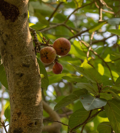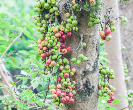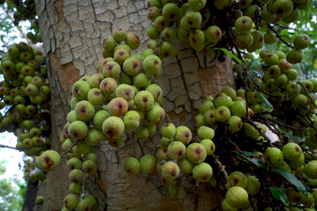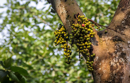 Close up of Ficus nota fruit on its tree trunk, a type of fig tree found in Yogyakarta, Indonesia.