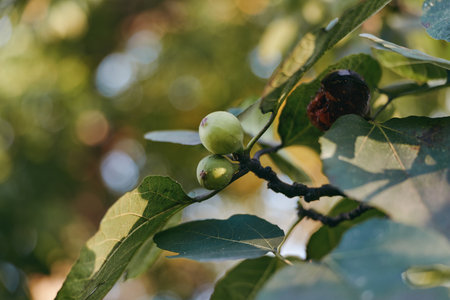 Unripe fig, fig fruit, branch and leaves in closeup with soft bokeh and warm sunlight in a garden orchard setting, organic growth and ripening on twig, natural summer mood, no people.