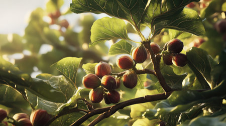 A close-up view of fresh figs growing on a branch surrounded by lush green leaves, capturing the essence of summer and natural beauty in a garden setting.