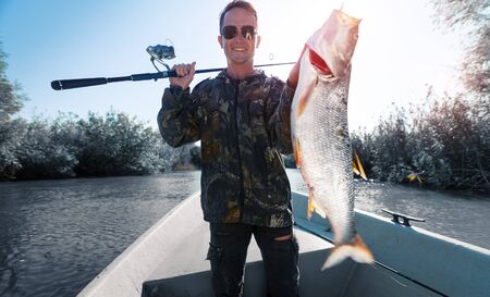 Happy fisherman holds trophy Asp fish being in the boat on a river. Fish is motion blurred