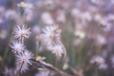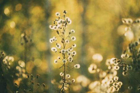 Meadow flowers, beautiful fresh in soft warm light. Vintage autumn landscape blurry natural background.