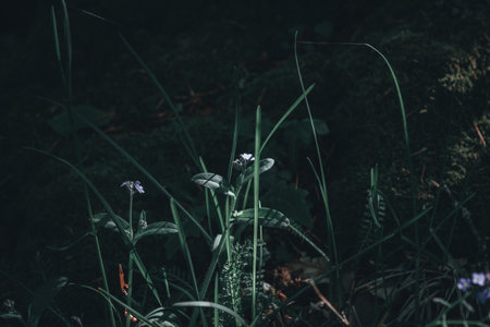 Vibrant purple flowers bloom, creating a serene and mystical atmosphere against a cool blue backdrop