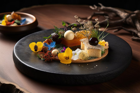 a beautifully composed plate of artisanal food, showcasing the chefs creativity and skill, created with generative ai
