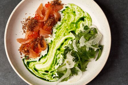 Seafood restaurant dish on dark background with copy space, close-up. smoked salmon fish, red caviar, rye crackers, green oil and onion.