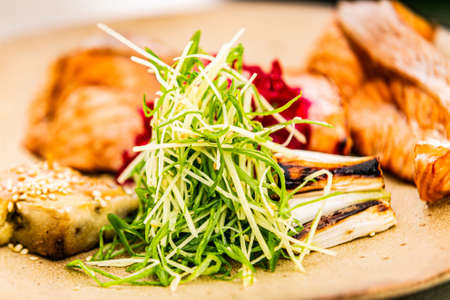 Grilled salmon with vegetables.The food in the restaurant. Food styling and restaurant meal serving.