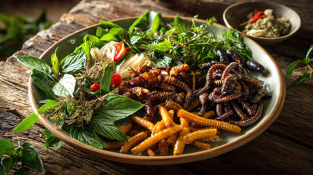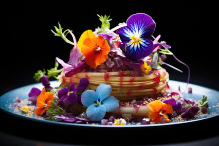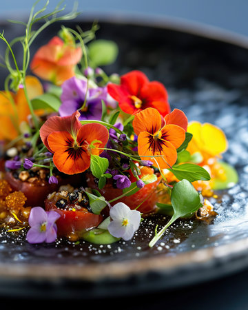 A stunning gourmet dish featuring colorful edible flowers and fresh herbs, creating a visually inviting and artistic culinary experience. Perfect for food enthusiasts!