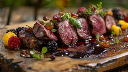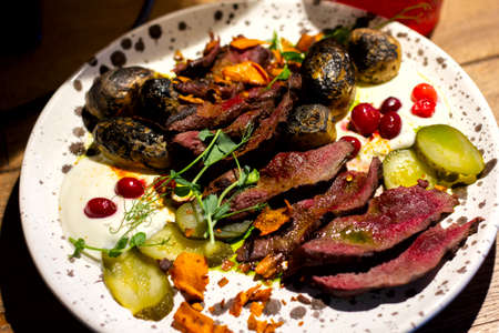 a beautiful dish with fried meat steak cut into slices and decorated with cranberries, cucumbers, herbs and white sauce close-up