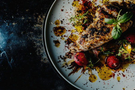 Gourmet grilled chicken with herbs and cherry tomatoes on elegant plate.