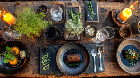 A beautifully arranged dining table showcases gourmet dishes, candles, and fresh herbs, creating an inviting atmosphere for a memorable meal experience.