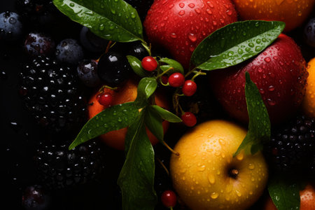 Colorful fruits and berries arranged on green leaves against a black background.