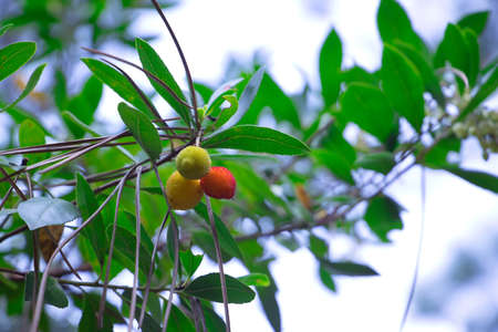 Arbutus or strawberry tree flower, leaves and fruit. Selective focus. Horizontal photography. Copy space.