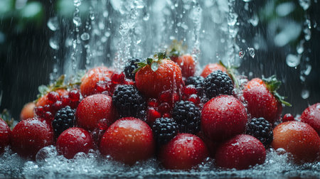 A close-up of fresh mixed berries covered in sparkling water droplets, creating a vibrant and juicy visual.